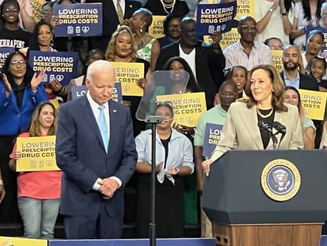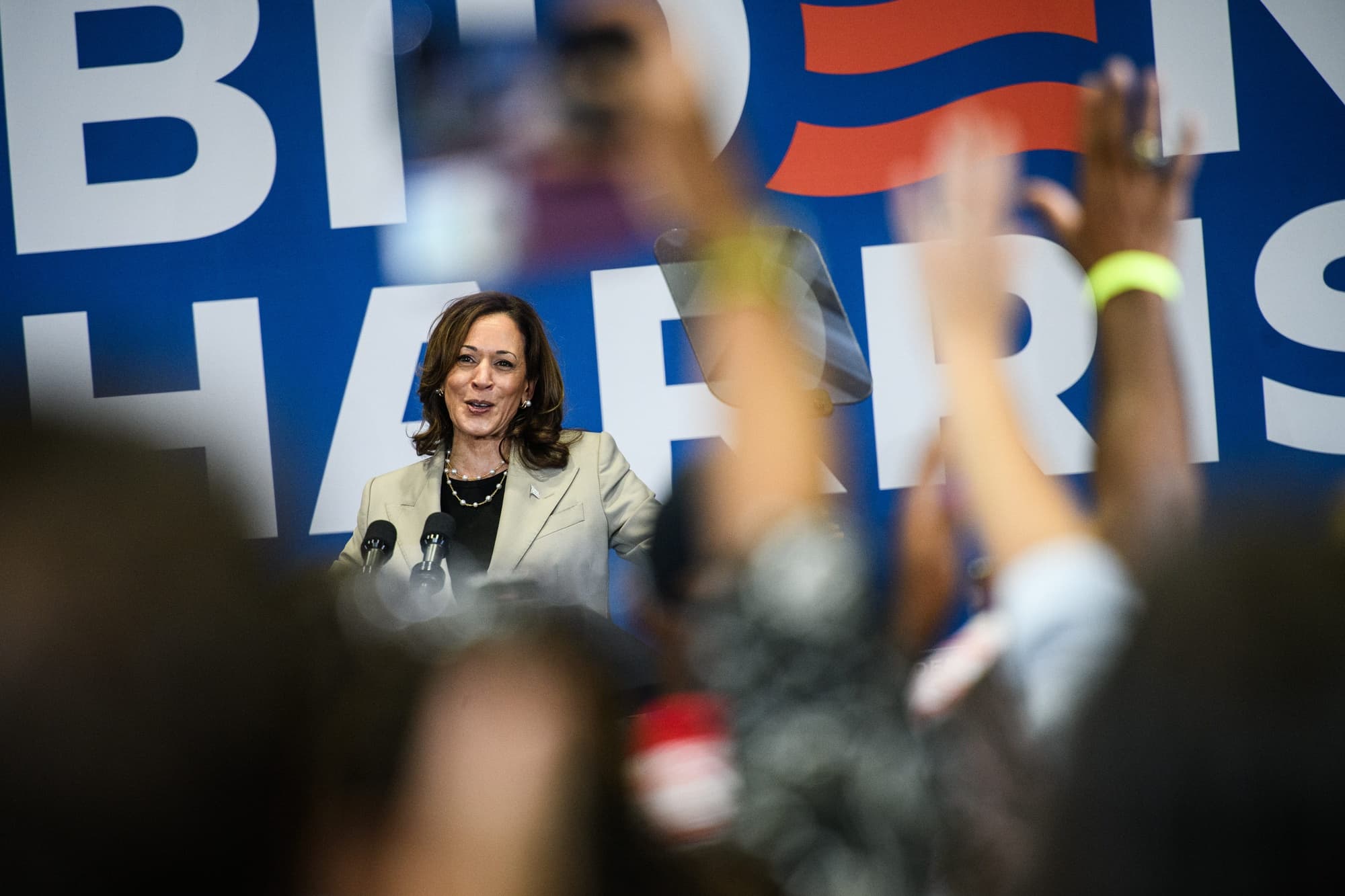Vice President Kamala Harris stands at the lectern in Upper Marlboro, Maryland